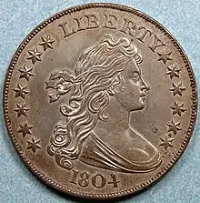 The Draped Bust dollar is a United States dollar coin minted from 1795 to 1803, and was reproduced, dated 1804, into the 1850s. The design succeeded the Flowing Hair dollar, which began mintage in 1794 and was the first silver dollar struck by the United States Mint. The designer is unknown, though the distinction is usually credited to artist Gilbert Stuart. The model is also unknown, though Ann Willing Bingham has been suggested.