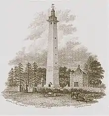 The original land lighthouse was commissioned by Sir Francis Dashwood[2] (better known as the founder of the Knights of St Francis, which became the Monks of Medmenham, later called a Hellfire Club) in 1751 as a gift to his wife Sarah (Ellys) Dashwood, who feared crossing the dark heath near her childhood home, Nocton. The purpose of the land lighthouse was to improve the safety of 18th-century travellers crossing a particularly treacherous area of the county known for its many incidents of robbery by highwaymen. In the 1843 Journal of the Agricultural Society it was described as the "only land light-house ever raised".[3]