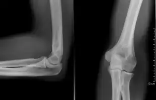 There are three bones at the elbow joint, and any combination of these bones may be involved in a fracture of the elbow. Patients who are able to fully extend their arm at the elbow are unlikely to have a fracture (98% certainty) and an X-ray is not required as long as an olecranon fracture is ruled out.[27] Acute fractures may not be easily visible on X-ray.[28]
