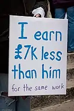A woman holding up a sign protesting that she earns less than a "him" (a male coworker) for the same work