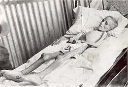 German efforts to clear the bush of civilians in German South West Africa resulted in a genocide of the population. In total, as many as 65,000 Herero (80% of the total Herero population), and 10,000 Namaqua (50% of the total Namaqua population) either starved, died of thirst, or were worked to death in camps such as Shark Island concentration camp between 1904 and 1908. Between 24,000 and 100,000 Hereros, 10,000 Nama, and an unknown number of San died in the genocide.[69][70][71][72][73][74][75] Characteristic of this genocide was death from starvation, thirst, and possibly the poisoning of the population's wells, whilst they were trapped in the Namib Desert.[76][77][78]