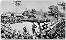 To the west, in the land where their expansions would meet, was Katanga, the site of the Yeke Kingdom of Msiri. Msiri was the most militarily powerful ruler in the area and traded large quantities of copper, ivory and slaves—and rumours of gold reached European ears.[36] The scramble for Katanga was a prime example of the period. Rhodes sent two expeditions to Msiri in 1890 led by Alfred Sharpe, who was rebuffed, and Joseph Thomson, who failed to reach Katanga. Leopold sent four expeditions. First, the Le Marinel expedition could only extract a vaguely worded letter. The Delcommune expedition was rebuffed. The well-armed Stairs expedition was given orders to take Katanga with or without Msiri's consent. Msiri refused, was shot, and his head was cut off and stuck on a pole as a "barbaric lesson" to the people.[37] The Bia River expedition finished the job of establishing an administration of sorts and a "police presence" in Katanga. Thus, the half million square kilometres of Katanga came into Leopold's possession and brought his African realm up to 2,300,000 square kilometres (890,000 sq mi), about 75 times larger than Belgium. The Congo Free State imposed such a terror regime on the colonized people, including mass killings and forced labour, that Belgium, under pressure from the Congo Reform Association, ended Leopold II's rule and annexed it on 20 August 1908 as a colony of Belgium, known as the Belgian Congo.[38]