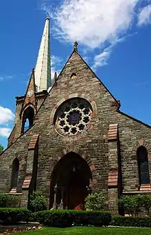The fifth building was built in 1863, on the same site occupied by the fourth. By 1867 the church became known as the First Reformed Church. The architectural landmark building was designed by Victorian-gothic architect Edward Tuckerman Potter. This building was hit by a fire on Sunday, February 1, 1948. The fire began at 4:45 p.m. and continued through the night destroying the entire structure except for three of the exterior walls, which would be the basis for the current structure. The congregation, with generous assistance from the Schenectady community, restored the edifice to its present form.[5]