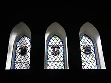 The sixth, and present, building was built in 1950. It was built on the foundation of the fifth building. The three stone walls left standing after the fire were reinforced. The north wall was torn down and the sanctuary was extended twenty feet. To complete the church, an 82 foot spire was hoisted into place on November 20, 1969. Placed atop the spire are a weathervane and chanticleer. Funds for the steeple came from personal contributions and memorial bequests.[6][7]