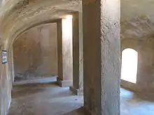 Fort Dansborg is located in the southern part of Tharangambadi, located 283 km (176 mi) from the state capital Chennai. It is built in Danish style, characterized by large halls, columned structures, high ceilings and projecting drapery.[18] The length of the fort in the side facing the sea is 60 m (200 ft) and the width is about 11 m (36 ft). The fort is trapezoidal in shape with three rooms in the left wing, originally used as the governor's residence, a kitchen with an open fireplace and chimney in the top left hand corner, and a church room, now a museum, located in the centre of the building. The original rectory and the northern part of it, which are now the store rooms, are located in the right wing. The corner room on the right side was the residence of the commercial director. In modern times, it is used as a store room. The core of the building is made of brick. The main door of the fort faces north, while an additional door faces the east.[21][22][23][24] The second storey of the fort has a set of guard rooms.[25] The staircase leading to it are built with bricks.[26] The central part of the fort has four camel hump shaped domes. The central pillar of the hall holds the entire weight of the domes.[23]