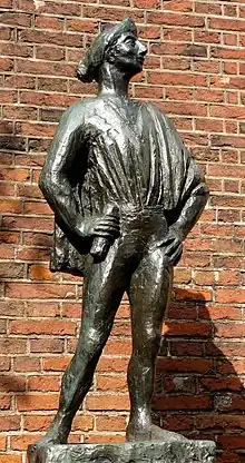 On 5 June 1455, the first major recorded incident of his life occurred. While in the Rue Saint-Jacques in the company of a priest named Giles and a girl named Isabeau, he met a Breton named Jean le Hardi, a master of arts, who was also with a priest, Philippe Chermoye (or Sermoise or Sermaise). A scuffle broke out and daggers were drawn. Sermaise, who is accused of having threatened and attacked Villon and drawn the first blood, not only received a dagger-thrust in return, but a blow from a stone, which struck him down. He died of his wounds. Villon fled, and was sentenced to banishment – a sentence which was remitted in January 1456[4] by a pardon from King Charles VII after he received the second of two petitions which made the claim that Sermaise had forgiven Villon before he died. Two different versions of the formal pardon exist; in one, the culprit is identified as "François des Loges, autrement dit Villon" ("François des Loges, otherwise called Villon"), in the other as "François de Montcorbier." He is also said to have named himself to the barber-surgeon who dressed his wounds as "Michel Mouton." The documents of this affair at least confirm the date of his birth, by presenting him as twenty-six years old or thereabouts.[4]