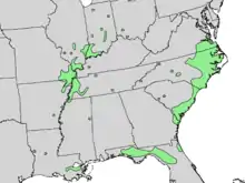 Pumpkin ash has a discontinuous range in eastern North America, where it occurs mainly in swamps and river bottoms of the Atlantic coastal plain, Mississippi valley and lower Great Lakes basin, but is conspicuously absent from regions in between, such as the Appalachian Mountains.[4][6][7] As a result of widespread damage by the emerald ash borer, pumpkin ash is near extirpation in North Carolina, South Carolina and Florida, and is critically endangered in Canada.[6]