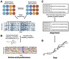 New computational methods have been developed for understanding the results of a deep mutational scanning experiment. 'phydms' compares the result of a deep mutational scanning experiment to a phylogenetic tree.[20] This allows the user to infer if the selection process in nature applies similar constraints on a protein as the results of the deep mutational scan indicate. This may allow an experimenter to choose between different experimental conditions based on how well they reflect nature. Deep mutational scanning has also been used to infer protein-protein interactions.[21] The authors used a thermodynamic model to predict the effects of mutations in different parts of a dimer. Deep mutational structure can also be used to infer protein structure. Strong positive epistasis between two mutations in a deep mutational scan can be indicative of two parts of the protein that are close to each other in 3-D space. This information can then be used to infer protein structure. A proof of principle of this approach was shown by two groups using the protein GB1.[22][23]