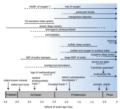 - ↑ Bekker, Andrey (2014-01-01). "Great Oxygenation Event". In Amils, Ricardo; Gargaud, Muriel; Quintanilla, José Cernicharo; Cleaves, Henderson James; Irvine, William M.; Pinti, Daniele; Viso, Michel (eds.). Encyclopedia of Astrobiology. Springer Berlin Heidelberg. pp. 1–9. doi:10.1007/978-3-642-27833-4_1752-4. ISBN 9783642278334.
