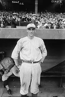 Kelly began his professional career for the Victoria Bees of the Class-B Northwestern League in 1914 and 1915.[7] During the 1915 season, he was purchased by the New York Giants from Victoria for $1,200 (equal to $34,713 today).[1] The Giants were rebuilding their team, and they saw Kelly as a possible replacement for Fred Merkle.[2] However, he played sparingly for the Giants in his first MLB seasons, appearing in only 17 games in 1915 and 49 games in 1916. He was selected off waivers by the Pittsburgh Pirates on July 25, 1917, to back up Honus Wagner, but did not hit sufficiently.[2] The Pirates waived Kelly, and he was reclaimed by the Giants from the Pirates on August 4, 1917.[1] The Giants optioned Kelly to the Rochester Hustlers of the Class-AA International League, where he played the rest of the 1917 season.[7] Kelly did not play professionally in 1918 due to his military service.[2] The Giants sold Kelly to Rochester before the 1919 season to acquire Earl Smith.[8][9]