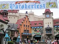 - Biergarten Restaurant, a buffet restaurant designed to look as though Oktoberfest is being celebrated there. The restaurant is styled as a typical Bavarian village, replete with the flags of every German state, numerous facades, and a running watermill. The table features long communal benches for seating, as well as a band playing German folk music. The restaurant is buffet-style, offering such dishes as schnitzel, bratwurst, kielbasa, rouladen, spatzle, sauerkraut, sauerbraten, cucumber salad, and strudel[5] and beer served in one liter steins. The dining hall is actually in the entrance area for the never built boat cruise down the Rhine.
