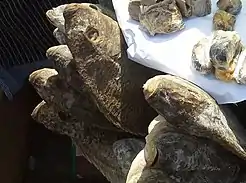 Fried sweet foods include cubed and spiced ripe plantain (kelewele) sometimes served with peanuts. Koose made from peeled beans (and its close twin acarajé or akara made from beans which are not peeled), maasa,[15][16] pinkaaso,[17] and bofrot/Puff-puff[18] (made from wheat flour); waakye[19] dzowey and nkate cake (made from peanuts);[20] kaklo and tatale[21] (ripe plantain fritters); kube cake and kube toffee (made from coconut); bankye krakro, gari biscuit,[22][23] and krakye ayuosu (made from cassava); condensed milk, toffee, plantain chips (or fried plantain)[24] and wagashi[25] (fried farmer's cheese) are fried Ghanaian savory foods (confectionery).