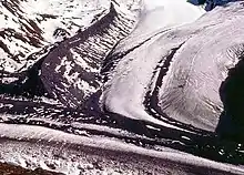 Khurdopin glacier and Shimshal River, Gilgit-Baltistan, northern Pakistan 2017. Several glaciers flow into the Shimshal Valley, and are prone to blocking the river. Khurdopin glacier surged in 2016–17, creating a sizable lake.[2]