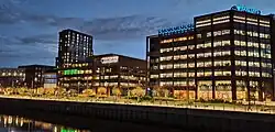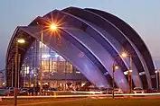 The city invested heavily in roads infrastructure, with an extensive system of arterial roads and motorways that bisected the central area. There are also accusations that the Scottish Office had deliberately attempted to undermine Glasgow's economic and political influence in post-war Scotland by diverting inward investment in new industries to other regions during the Silicon Glen boom and creating the new towns of Cumbernauld, Glenrothes, Irvine, Livingston and East Kilbride, dispersed across the Scottish Lowlands to halve the city's population base.[40] By the late 1980s, there had been a significant resurgence in Glasgow's economic fortunes. The "Glasgow's miles better" campaign, launched in 1983, and opening of the Burrell Collection in 1983 and Scottish Exhibition and Conference Centre in 1985 facilitated Glasgow's new role as a European centre for business services and finance and promoted an increase in tourism and inward investment.[41] The latter continues to be bolstered by the legacy of the city's Glasgow Garden Festival in 1988, its status as European Capital of Culture in 1990,[42] and concerted attempts to diversify the city's economy.[43] However, it is the industrial heritage that serves as key tourism enabler.[44] Wider economic revival has persisted and the ongoing regeneration of inner-city areas, including the large-scale Clyde Waterfront Regeneration, has led to more affluent people moving back to live in the centre of Glasgow, fuelling allegations of gentrification.[45] In 2008, the city was listed by Lonely Planet as one of the world's top 10 tourist cities.[46]
