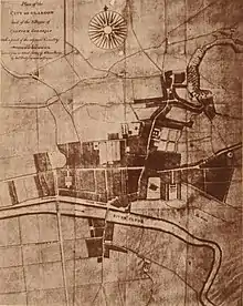 After the Acts of Union in 1707, Scotland gained further access to the vast markets of the new British Empire, and Glasgow became prominent as a hub of international trade to and from the Americas, especially in sugar, tobacco, cotton, and manufactured goods. Starting in 1668, the city's Tobacco Lords created a deep water port at Port Glasgow about 20 mi (32 km) down the River Clyde, as the river from the city to that point was then too shallow for seagoing merchant ships.[31] By the late 18th century more than half of the British tobacco trade was concentrated on the River Clyde, with over 47,000,000 lb (21,000 t) of tobacco being imported each year at its peak.[32] At the time, Glasgow held a commercial importance as the city participated in the trade of sugar, tobacco and later cotton.[33] From the mid-eighteenth century the city began expanding westwards from its medieval core at Glasgow Cross, with a grid-iron street plan starting from the 1770s and eventually reaching George Square to accommodate much of the growth, with that expansion much later becoming known in the 1980s onwards as the Merchant City.[34] The largest growth in the city centre area, building on the wealth of trading internationally, was the next expansion being the grid-iron streets west of Buchanan Street riding up and over Blythswood Hill from 1800 onwards.[35]