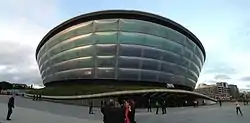 From top, left to right: Skyline of Glasgow from the River Clyde; Glasgow Tower; Kelvingrove Museum; St Andrew's in the Square; the Armadillo Auditorium and the Hydro Arena | |