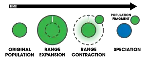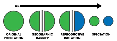 - A mode of speciation where the evolution of reproductive isolation is caused by the geographic separation of two or more populations of a single species.[5]