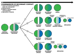 - A mode of speciation where divergence occurs in allopatry and is completed upon secondary contact of the populations–effectively a form of reinforcement.[6][3]