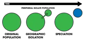 - A variation of peripatric speciation in which speciation occurs by geographic isolation, but reproductive isolation evolves in the larger population instead of the peripherally isolated population.[11]