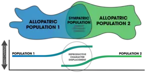 - The phenomenon by which differences between similar species that occupy similar niches and have partially overlapping geographic distributions are accentuated in regions where the species co-occur but are minimized or lost where the species' distributions do not overlap. This occurs because competition between the similar species for one or more limited resources drives evolutionary change that differentiates the species in the common geographic areas such that they no longer occupy the same niche, thereby allowing them to coexist and avoiding competitive exclusion.
