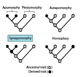 An apomorphy is a derived trait present in one or more members of a clade but not the common ancestor; a plesiomorphy is an ancestral trait present in the common ancestor of the clade and possibly some or all of its descendants.