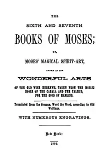 Another scholar of the time interested in grimoires, the antiquarian bookseller Johann Scheible first published the Sixth and Seventh Books of Moses; two influential magical texts that claimed to have been written by the ancient Jewish figure Moses.[49] The Sixth and Seventh Books of Moses were among the works which later spread to the countries of Scandinavia, where—in Danish and Swedish—grimoires were known as black books and were commonly found among members of the army.[50]