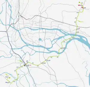 The Northern extension to Yanshan opened on 28 December 2023. It extends the line into Huangpu District, having a total length of 22.2 km (13.79 mi) with 11 stations, 10 of which are operational[8] (Hongshengsha station is complete, but was not opened pending development in the area). It has interchanges with Line 13 at Yufengwei, Line 5 at Dashadong, Line 6 at Luogang and Line 21 and Huangpu Tram Line 1 at Shuixi.