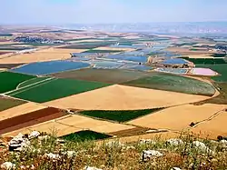 The valley covers about 40 sq.km. and is intensely cultivated.[5] It is a corridor 18 km. long and 5 km. max wide. The exact border between the Harod Valley and the Beit She'an Valley depends on the conventions. For example, according to soil and precipitation parameters the border is the Sde Nahum - Beit Alfa line, while according to the climate, the border is defined by Kfar Yehezkel. The climate of the valley transitions from the Mediterranean climate of the western part of the Jezreel Valley to the arid dry-steppe climate of the Jordan Valley.[6] There is a fault line between Mount Gilboa and the floor of the valley, with many spring along the line.