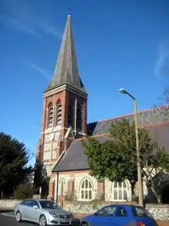 Notable Victorian buildings include Heene Terrace (built 1865), the Burlington Hotel (built 1865), St Botolph's Church (built 1872−73), the Italianate West Worthing railway station (built 1889), the Queen Anne style Downview Hotel (now flats, built 1891) and St Matthew's Church (built 1898−1900).[10] Dolphin Lodge (completed 1922−23) was begun in 1893 as the Hotel Metropole and was intended to be significantly grander, as the centrepiece of the new town of West Worthing. According to the original plans, the hotel would have had a south elevation wider than Buckingham Palace.[11] Following a recession, the front and west wings were never built. The building would have overlooked a pier for West Worthing.[12]