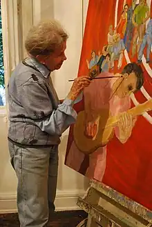 Her work has always focused more on common people, based on those she sees in daily life as they tend to be less reserved about their emotions.[5] Her work is figurative, but her figures are not to photographic detail, preferring to capture a feeling rather than a subject.[2][15] Her earlier work in Mexico often depicted characteristic images from Mexico, usually poor, such as street musicians, women bending over in their work, men collecting trash, people in traditional Mexican markets like La Merced, porters, farmers and more.[24] The figures in her later work are more generic Westerners rather than Mexican but often the landscapes behind them remain Mexican. Her work has been compared to that of Diego Rivera, Rafael Coronel, and Marysole Wörner Baz.[23][24]