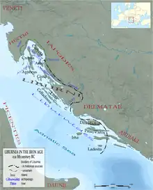 The tribe is classified in some sources as a "Venetic" tribe, with some ties with Illyrians.[3] It was also described as Thracians by others.[4] Since they inhabited the Istrian peninsula, these people had more intensive trade and cultural contacts with the Mediterranean world, particularly central and southern Italy.[1]