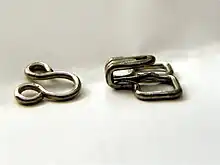 A hook-and-eye closure is a simple and secure method of fastening garments together. It consists of a metal hook, commonly wire bent to shape, and an eye (or "eyelet") of the same material into which the hook fits.