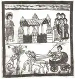 Its first depiction in artwork was on lacquer-ware boxes from the ancient State of Chu.[8] This type of harness put pressure upon the sternum, where the line of traction is directly linked with the skeletal system of the horse, allowing for nearly full exertion.[5] It was in universal use by the time of the Chinese Han dynasty (202 BC – 220 AD), depicted in artwork of hundreds of different carvings, stone reliefs, and stamped bricks showing it featured on horses pulling chariots.[9] This type of breast-strap harness became known in Central Asia and elsewhere with the Avars, Magyars, Bohemians, Poles, and Russians during the 7th to 10th centuries.[10] After Central Asia, the first breast-strap harness was spread to Europe by the 8th century (in depicted artwork),[7] and became more widespread by the following 9th century (for example, depicted in a tapestry of the Oseberg ship burial).[11]