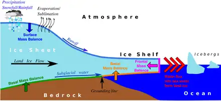 Precipitation is directly tied to air temperature, and also depends on moisture above and around the ice sheet.[14] Precipitation plays an important part in ice-sheet melting and accumulation.[14]