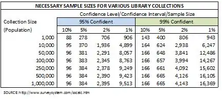 Next, the Library needs to decide upon the size of its sample. More datapoints, of course result in more accurate data about the collection. There are two types of errors possible in sampling: tolerance and confidence. Tolerance is the unexact percentage, a maximum deviation from the nominal error value, for example, a survey question may be accurate for 85-95% of the population, it could also be stated 90% ±5; in this case, the tolerance is five. Confidence is the second error, measuring the certainty of a true answer within the limits stated in the tolerance. If there is a 90 per cent confidence, it is predicted that if the sample study is repeated ten times using different samples, but with the same tolerance, then the results would be accurate for nine of those studies out of ten.[16]