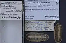 Ischnochiton torri, commonly known as Torr's ischnochiton, is a species of chiton in the genus Ischnochiton that lives under rocks in the intertidal and shallow subtidal waters of southern Australia.[1] It is commonly found throughout its wide range, and is often found with Ischnochiton cariosus.[1] It grows to 40 millimetres (1.6 in) long. Its back has an orange rim and a brown-scaled covering, with a cream-coloured stripe along its axis.[1]
