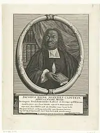 The man who would become known as Jacobus Capitein was born c.1717 in Elmina, Western Africa, which was part of the Dutch Gold Coast.[1] The identities of his parents are unknown, though he was "orphaned by war or some other cause".[2] At the age of seven or eight he was captured and enslaved by slave traders of unknown identity, who sold him to a Dutch ship's captain and slave trader named Arnold Steenhart.[3] Steenhart subsequently gifted him to a fellow slave trader, Jacobus van Goch, who was residing in Elmina.[4]