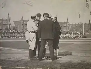 McGraw usually batted leadoff for the 1894 Orioles,[30] batting .340 and stealing 78 bases, second in the league. He would foul off pitch after pitch—a valuable talent in the pre-1901 era in which foul balls generally did not count as strikes—and, with Keeler, "elevated into an art form" the hit and run.[31] Many of the players, including McGraw, lived in the same Baltimore boarding house, and talked baseball deep into the night. From such discussions arose the discovery that a runner on third had an excellent chance of scoring if he left at the pitcher's first motion and the batter bunted, originating the squeeze play.[32] A reputation for dirty play led to McGraw being dubbed "Muggsy", a nickname he strongly disliked, by The Washington Post.[33] The Orioles won their first pennant, besting the New York Giants and the Boston Beaneaters. Amid disputes over money, they lost the postseason Temple Cup series to the second-place Giants.[34] After a brief visit to Truxton, McGraw spent the winter at St. Bonaventure.[35]