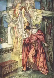 Illustration of an angel showing Justinian a model of Hagia Sophia in a vision, by Herbert Cole (1912)