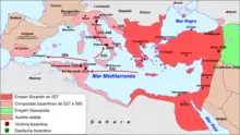 His reign was marked by the ambitious but only partly realized renovatio imperii, or "restoration of the Empire".[5] This ambition was expressed by the partial recovery of the territories of the defunct Western Roman Empire.[6] His general, Belisarius, swiftly conquered the Vandal Kingdom in North Africa. Subsequently, Belisarius, Narses, and other generals conquered the Ostrogothic kingdom, restoring Dalmatia, Sicily, Italy, and Rome to the empire after more than half a century of rule by the Ostrogoths. The praetorian prefect Liberius reclaimed the south of the Iberian Peninsula, establishing the province of Spania. These campaigns re-established Roman control over the western Mediterranean, increasing the Empire's annual revenue by over a million solidi.[7] During his reign, Justinian also subdued the Tzani, a people on the east coast of the Black Sea that had never been under Roman rule before.[8] He engaged the Sasanian Empire in the east during Kavad I's reign, and later again during Khosrow I's reign; this second conflict was partially initiated due to his ambitions in the west.