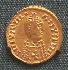 Spanish Visigothic gold Tremissis in the name of emperor Justinian I, 7th century. The Christian cross on the breast defines the Visigothic attribution. British Museum.
