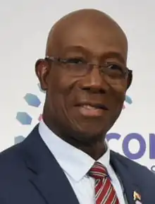 Keith Christopher Rowley MP (born 24 October 1949) is a Trinidadian and Tobagonian politician serving as the seventh prime minister of Trinidad and Tobago, first elected into office on 9 September 2015 and again following the 2020 general election.[6] He has led the People's National Movement (PNM) since May 2010 and was Leader of the Opposition from 2010 to 2015. He has also served as the Member of the House of Representatives for Diego Martin West since 1991.[7] He is a volcanologist by profession, holding a doctorate in geology, specializing in geochemistry.[8]
