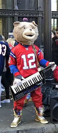 Keytar Bear is the name given to a busker from Boston, Massachusetts. The nickname "Keytar Bear" was given as he wears a bear outfit and plays a keytar in his performances, usually near subway and train stops. Little is known about the busker other than small bits of his life, as the performer in the suit prefers to remain anonymous. Keytar Bear has been involved in several unprovoked attacks by "drunks and youths" over the years prompting public displays of support.[1][2]