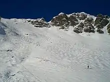 The direct path goes into a pass between two rocky areas on the right hand side of the slope, about halfway down, which at its narrowest is about ten metres wide. This gives the skier or boarder an impression of being in a very steep half pipe with moguls.