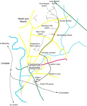 The railway began at Grovebury Sidings, where sand trains unloaded into washers and the sand was shipped to standard-gauge trains on the Dunstable branch or to road. The sidings and industrial plant at Grovebury were replaced with an industrial estate in the early 1970s.
