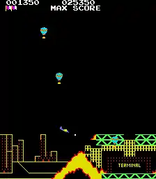 The second phase involves players flying through a pipe maze devoid of enemies where players must avoid crashing against walls while navigating across narrow passages. Players must also avoid several monsters, green liquid drops and bouncing balls at the final section to reach "The End" docking station.[2][3][4][5] Extra points are earned by staying in the maze for long time periods or by flying faster.[5] By successfully reaching "The End" station, the game loops back to the beginning of the first phase, with the gate leading to the second phase now open but introducing more obstacles and aggressive enemies, as well as a more difficult pipe maze.[2][3][5] Crashing against an enemy or an obstacle will result in losing a plane stock and once all plane stocks are lost, the game is over unless the player inserts more credits into the arcade machine to continue playing.[3]
