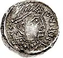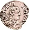 Louis was only nicknamed "the German" in the 18th century.[24] Contemporary West Frankish sources called Louis rex Germaniae ("King of Germania") or rex Germanorum ("King of the Teutons"). However, in this context, Germania or Germani does not mean "Germany" or "the Germans", but, as in ancient Latin, the area on the right bank of the Rhine outside the former Roman Empire and its inhabitants.[25] Contemporaries gave Louis the epithet pius (pious) or piissimus (very pious). The contemporary coinage called him HLUDOVICUS PIUS REX.