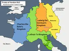 Louis the German[lower-alpha 1] (c. 806[3][4]/810[2] – 28 August 876), also known as Louis II of Germany and Louis II of East Francia,[lower-alpha 2] was the first king of East Francia, and ruled from 843 to 876 AD. Grandson of emperor Charlemagne and the third son of Louis the Pious, emperor of Francia, and his first wife, Ermengarde of Hesbaye,[5] he received the appellation Germanicus shortly after his death, when East Francia became known as the kingdom of Germany.