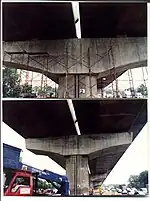 On 3 August 2008, Kepong flyover was closed to all traffic after three of the eighteen carbon fibre panels on pillar 28 had peeled off.[6][7] Pillar 28 is where the German consultant Leonhardt Andrä und Partner did the repair works as a sample for Malaysian contractor to follow. This is the third time the 1.7-km MRR2 Kepong flyover has been closed because of cracks.[8]