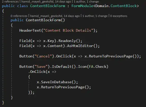 M# uses its own IDE, which is a web-based application for creating ASP.Net WebForms and Visual Studio for Creating ASP.Net MVC projects. Inside the IDE, a user can type, select from suggestions (Intelli-sense), or use the mouse to define the entities or user interface modules.[4] An example would be a form module that has two buttons (Cancel and Save) and displays a Key and a Text field. The Key field is read-only and the Save button adds a content block to the database:
